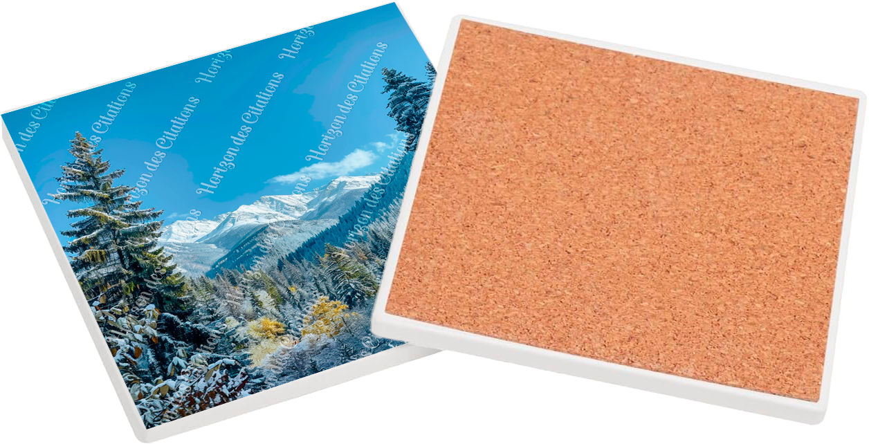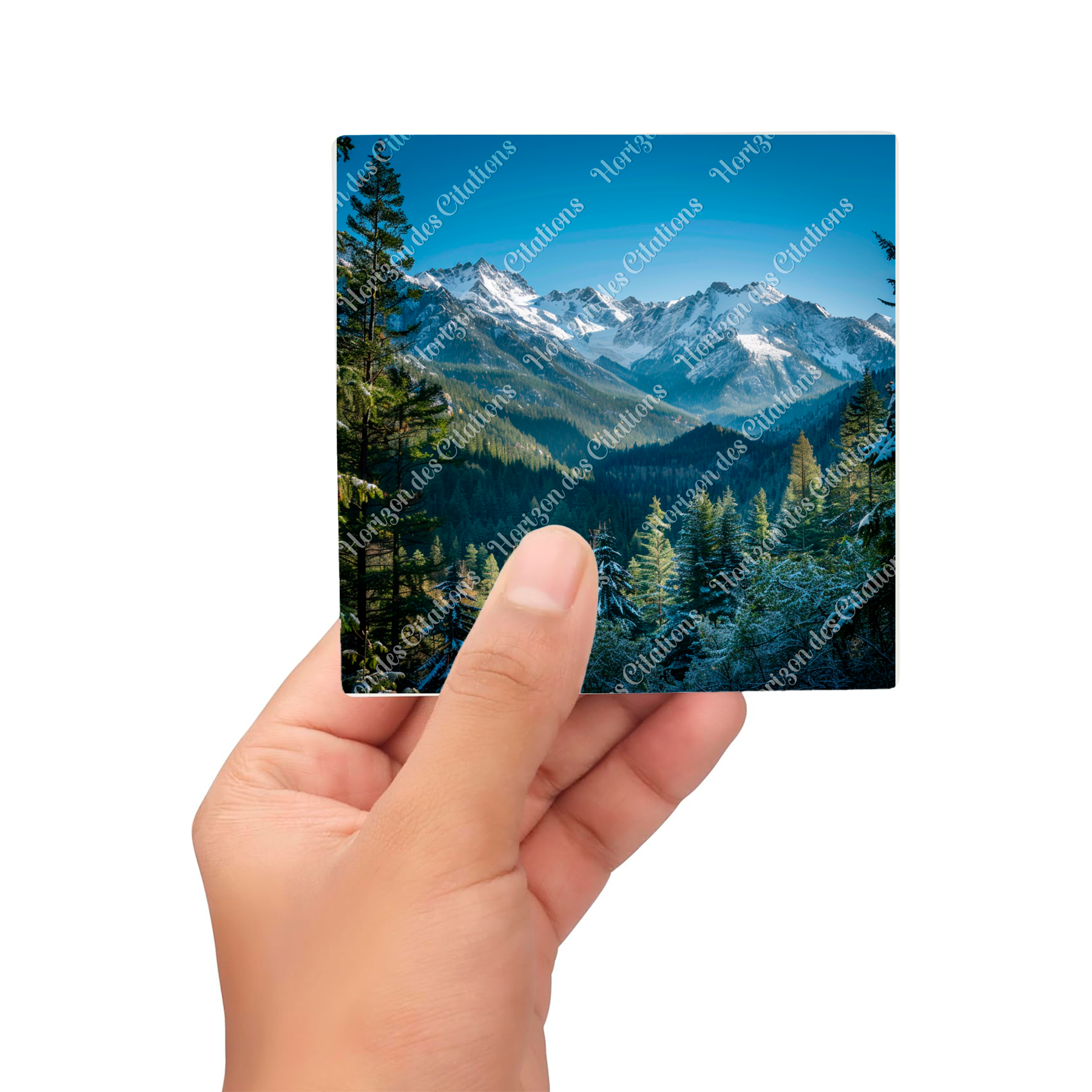 Ces quatre sous-verres en céramique mettent en valeur la beauté majestueuse des forêts enneigées et des chaînes de montagnes étincelantes sous un ciel d’un bleu limpide.