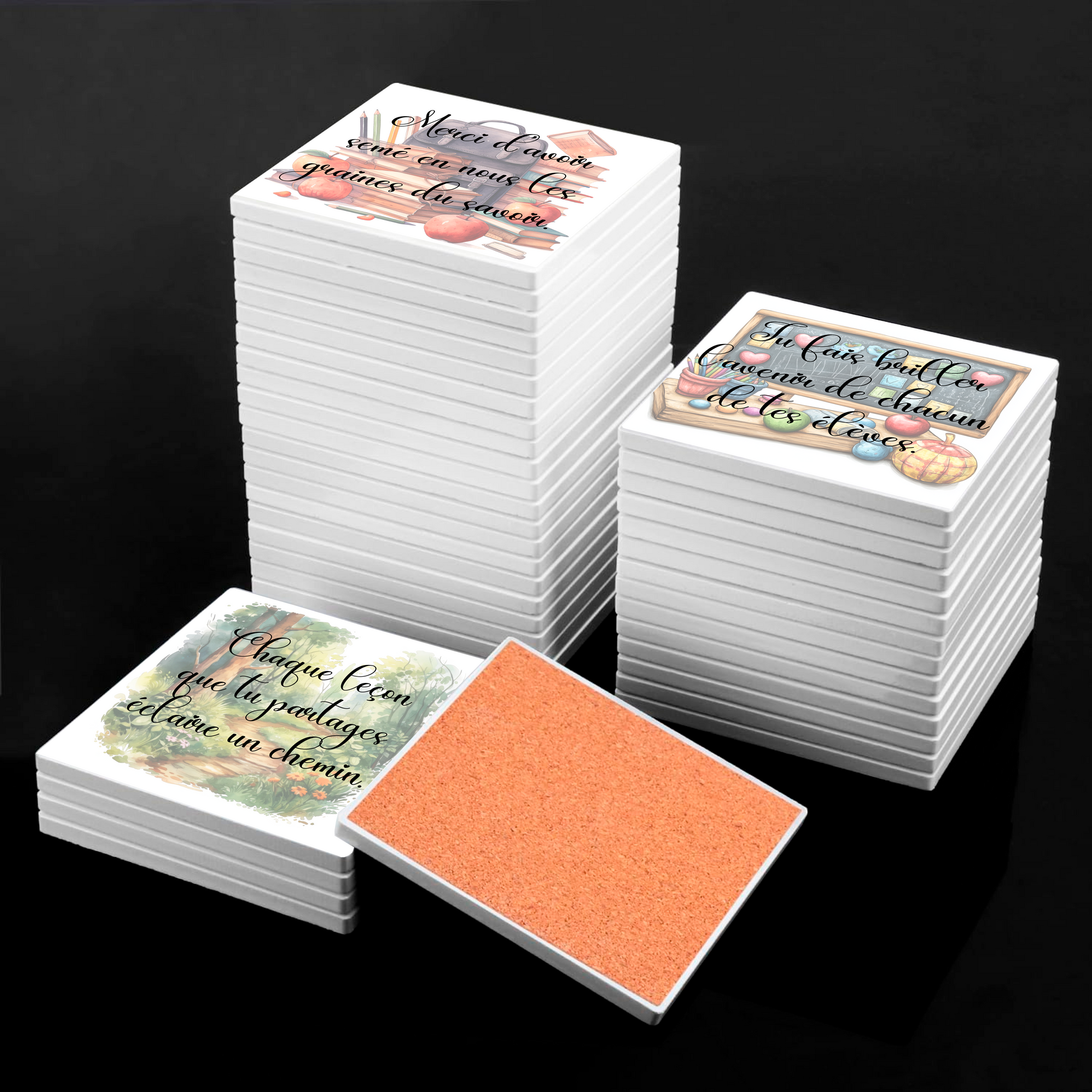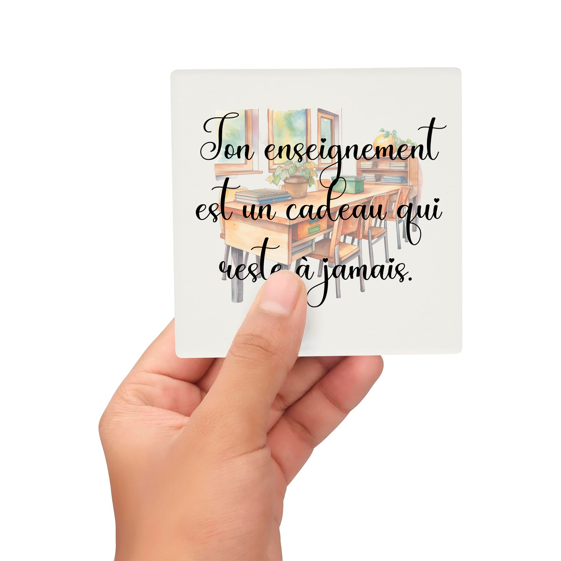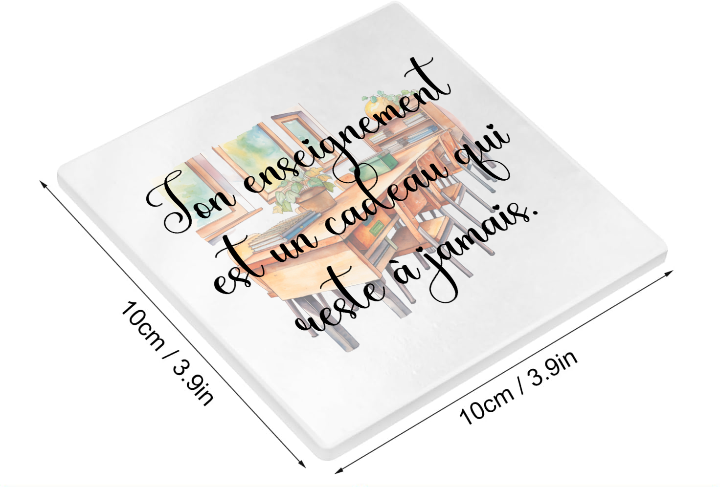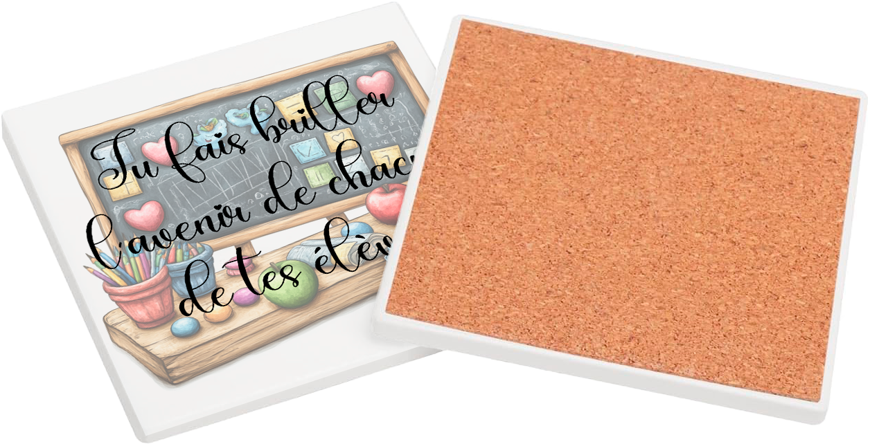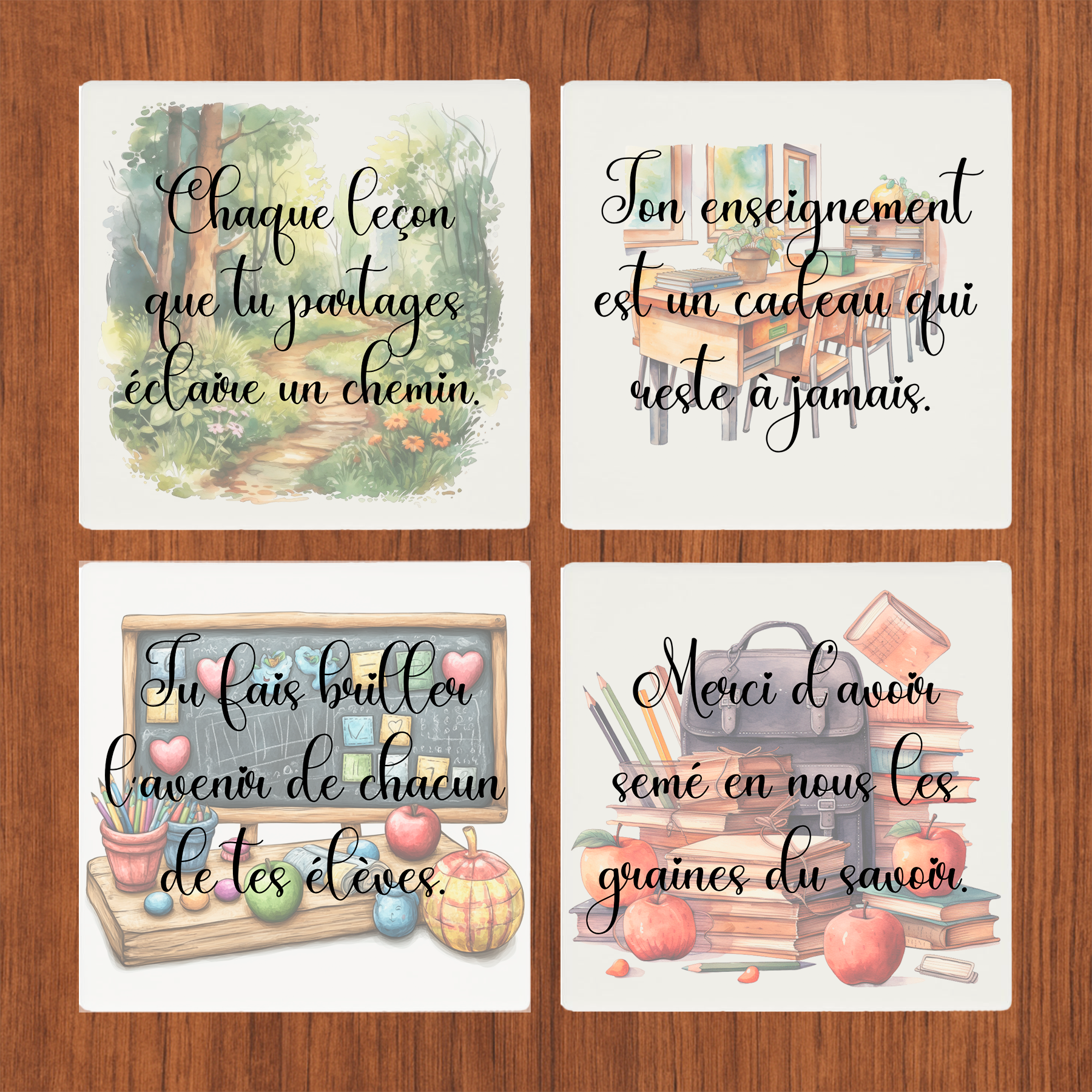 Offrez un merci qui dure dans le temps avec cet ensemble de 4 dessous de verre en céramique, conçu spécialement pour souligner le travail exceptionnel d’un(e) professeur(e). Chaque pièce met en valeur une illustration douce et colorée, accompagnée d’un message touchant qui célèbre l’engagement, la passion et l’impact d’un(e) enseignant(e).