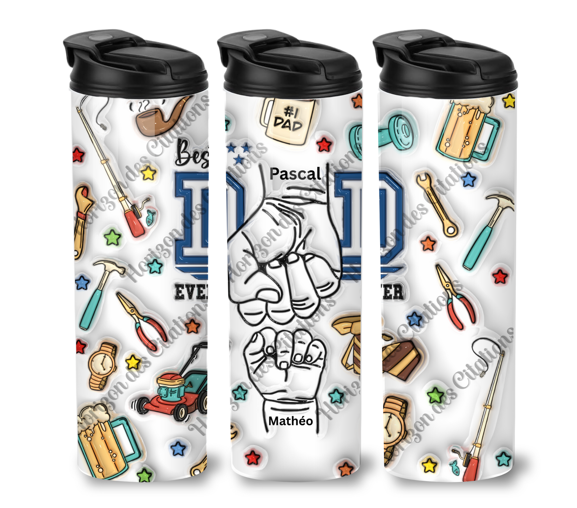 Ce tumbler 20oz célèbre les papas dans toute leur splendeur : ceux qui réparent, consolent, enseignent, rient et aiment fort. Avec ses illustrations colorées inspirées de l’univers masculin et familial (outils, café, bières, cravates et plus encore), il capture l’essence même de la paternité active et joyeuse.