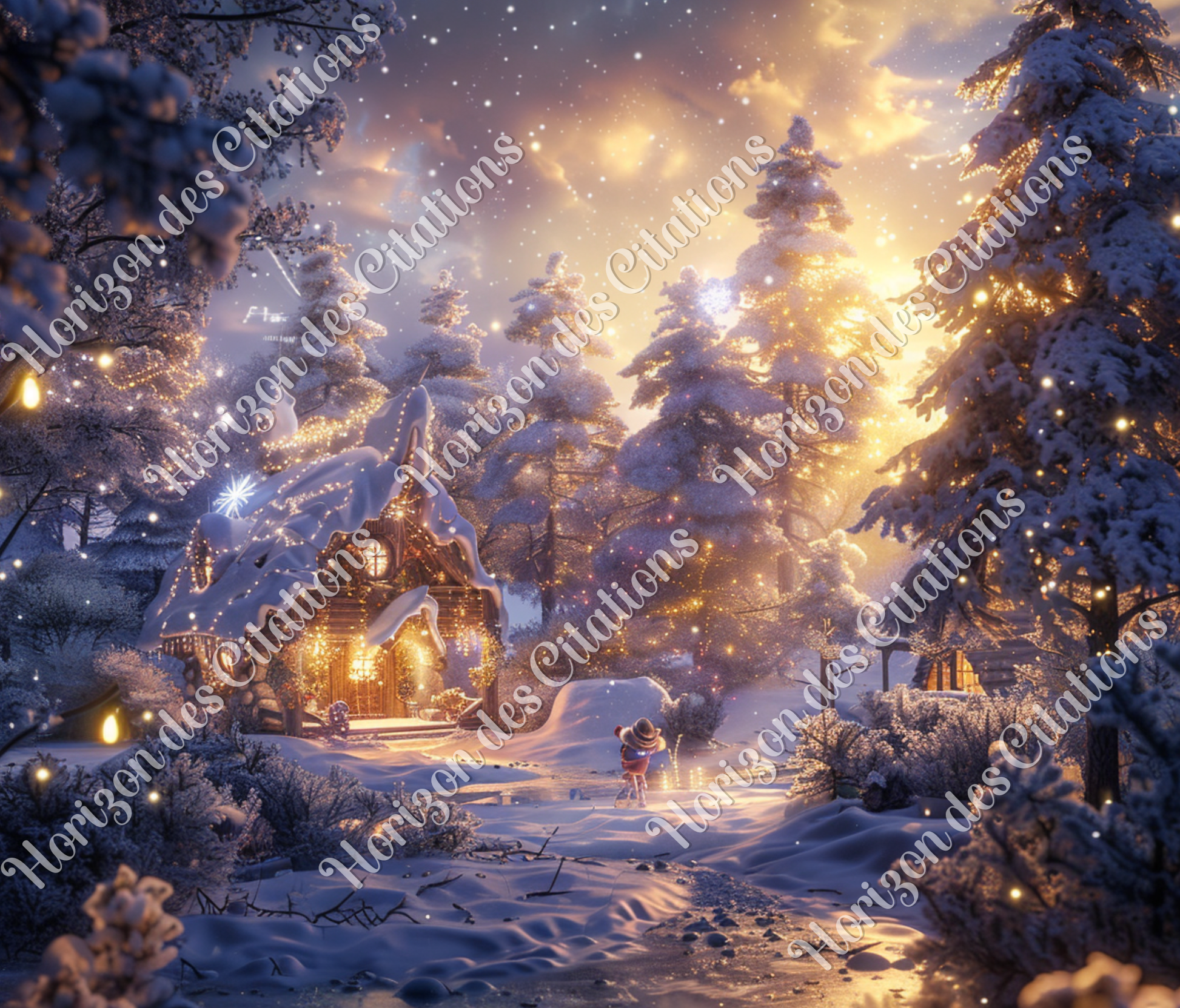 Un petit personnage contemple la magie du paysage, baigné par une lumière dorée — comme un rêve d’hiver au coin du feu.